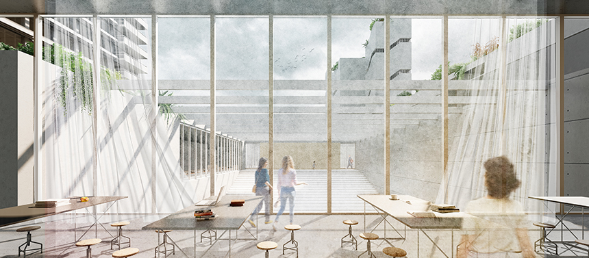 Exhibition of the results of the aac workshop "800 Bell Street - From Midcentury Monument to Shared Civic Stage” at Campus Rainvilleterrasse.